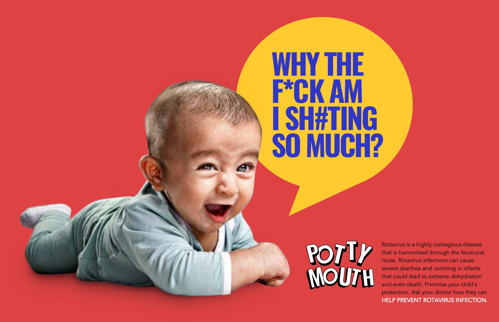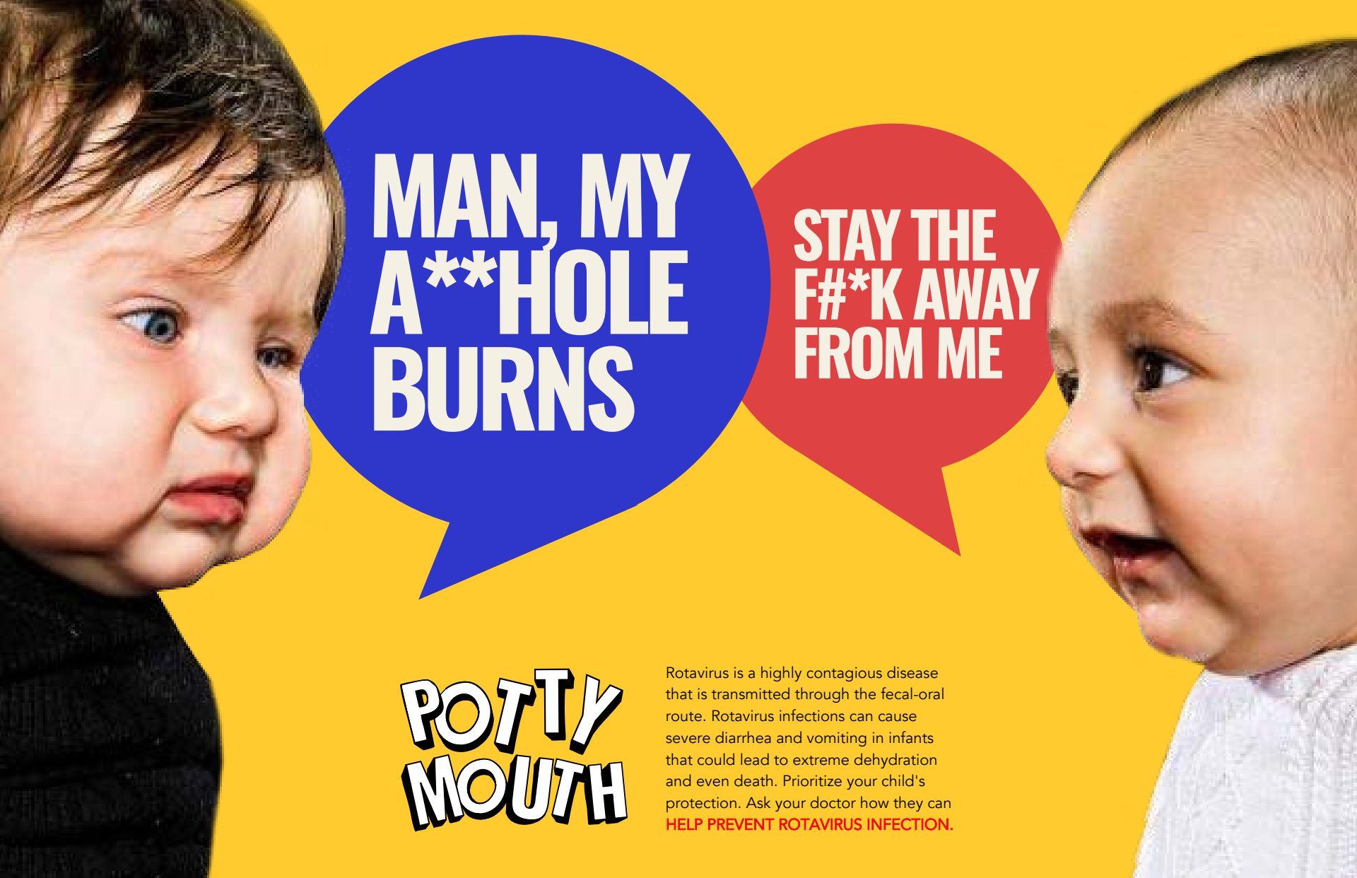 Pottymouth—a provocative, symptom-forward campaign using bold, censored profanity to capture attention and communicate the distress of rotavirus infection.