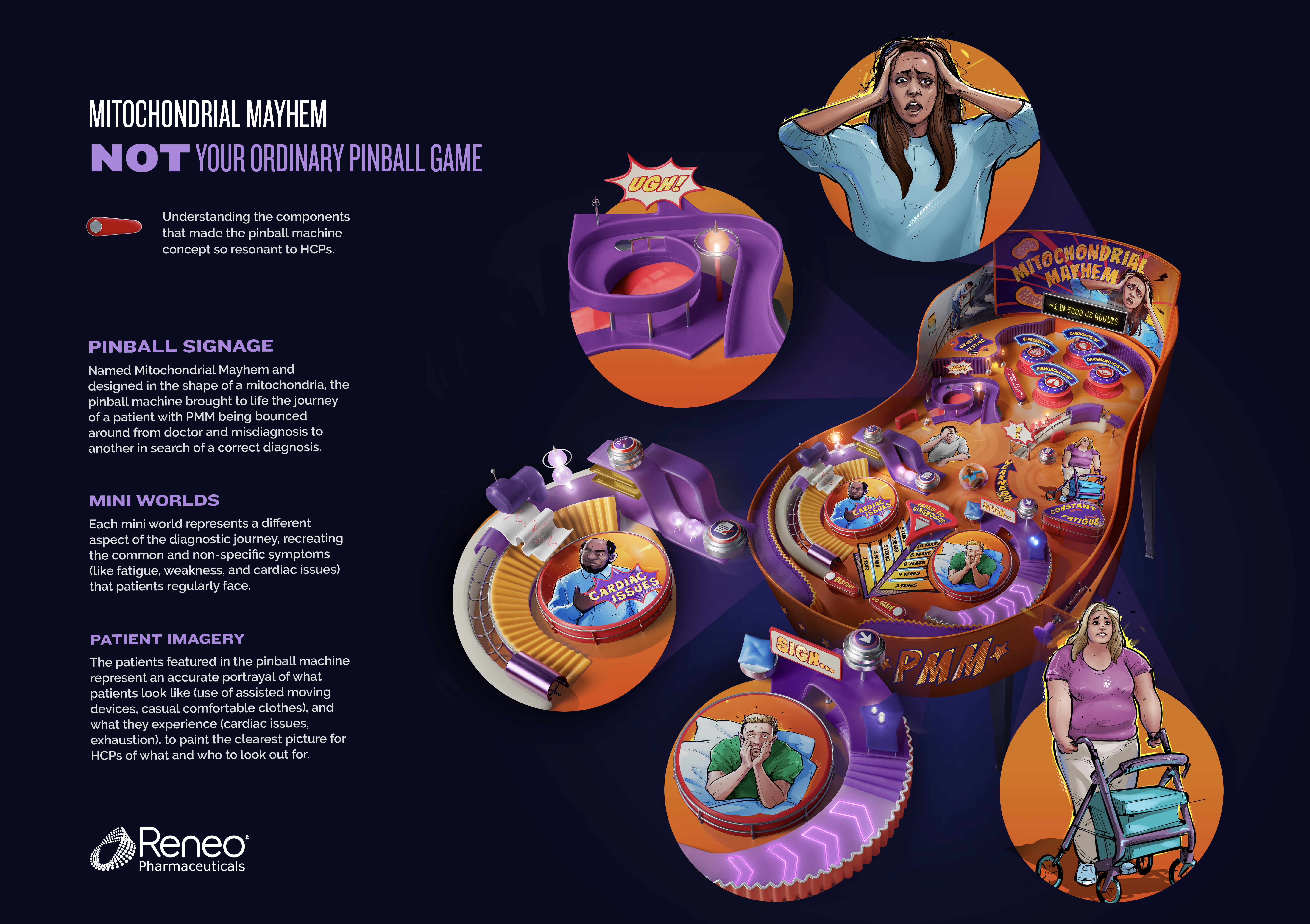 Mitochondrial Mayhem—a pinball machine designed in the shape of a mitochondrion—brought the PMM diagnostic odyssey to life. Each “mini world” in the game represented a key obstacle: misleading symptoms, specialist referrals, misdiagnoses, and years of uncertainty. The ball—symbolizing the patient—bounced endlessly between these barriers, perfectly illustrating the exhausting loop many face before receiving an accurate diagnosis.