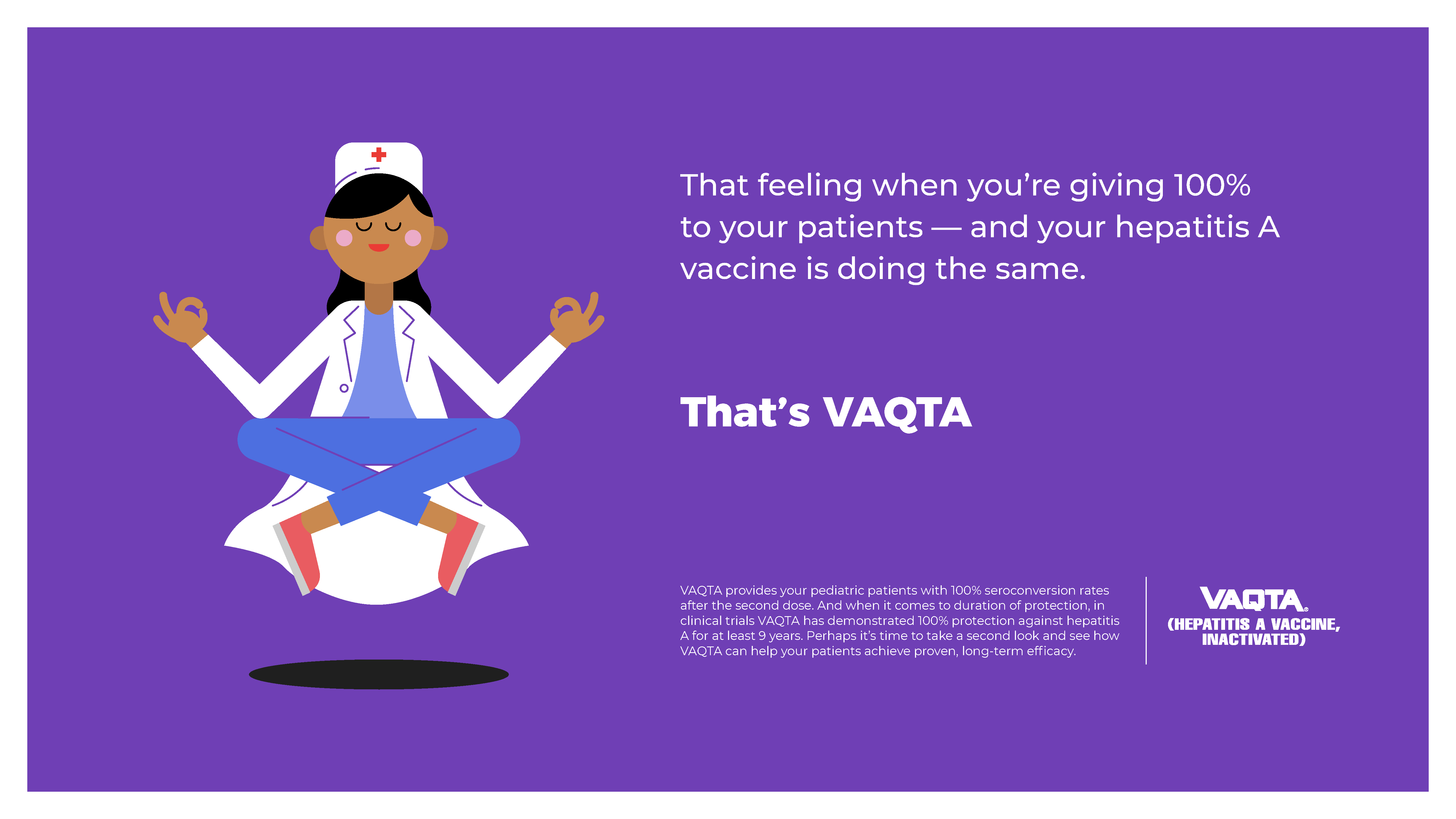 That VAQTA Feeling—an illustrated campaign that personifies the elation of delivering unmatched vaccine efficacy. By pairing whimsical, uplifting visuals with headlines that connect physician dedication to VAQTA’s proven performance, the work invited viewers to smile while reinforcing the brand’s clinical achievement.